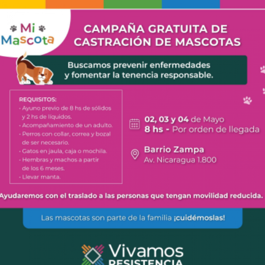 La castración gratuita que ofrece la Municipalidad de Resistencia a través del programa "Mi Mascota" continuará los días 2, 3 y 4 de mayo. El quirófano móvil se establecerá en avenida Nicaragua al 1800, en el barrio Zampa, mientras que las jornadas 5, 6 y 9 del mismo mes se trasladará al barrio Insssep, más precisamente en avenida Islas Malvinas al 2675.