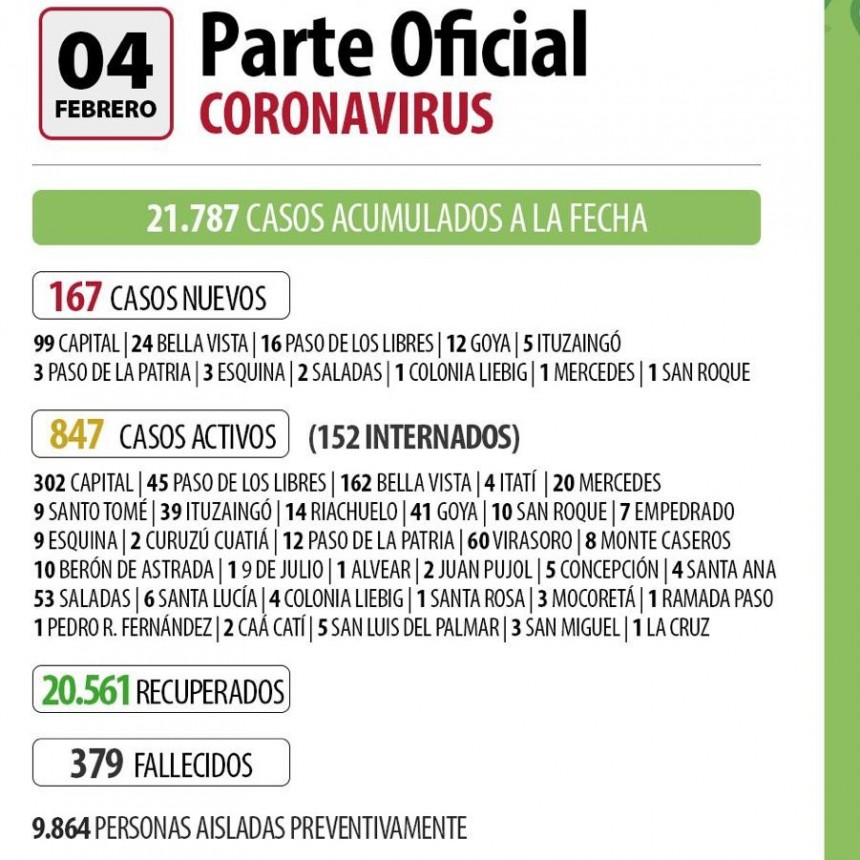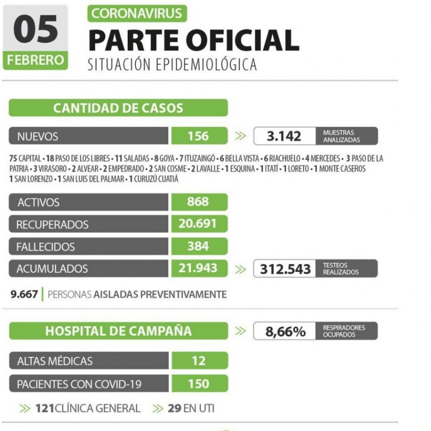 El Ministerio de Salud Pública de Chaco informa que, hasta este lunes 8 febrero de 2.021, se registraron 31.666 casos positivos de COVID-19, entre los cuales, un total de 29.694 personas ya recibieron el alta clínica y otros 1.156 casos se encuentran activos.