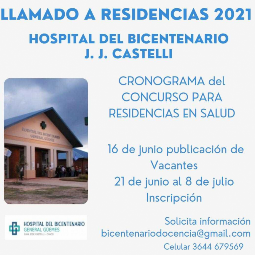 El Ministerio de Salud de la Nación aprobó la incorporación del Hospital del Bicentenario de Juan José Castelli, como sede de nuevas Residencias Médicas 2021 en Clínica General, Pediatría, Toco ginecología, Enfermería en la Atención del Paciente Crítico Adulto, Bioquímica Clínica, Salud Mental Multidisciplinaria, Enfermería, Materno- infancia y adolescencia. Las inscripciones estarán abiertas desde el lunes 21 de junio hasta el jueves 8 de julio.