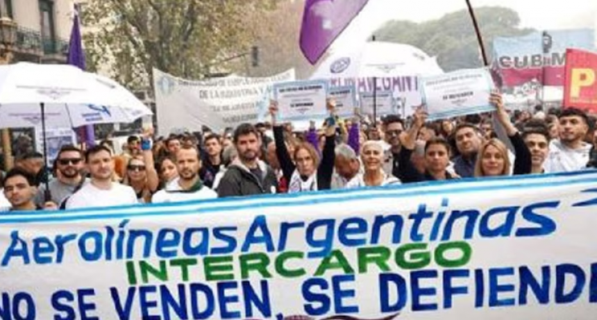Trabajadores aeronáuticos nuclaeados bajo los 5 sindicatos del sector se reúnen en el Congreso para marchar contra la privatización de Aerolíneas Argentinas.