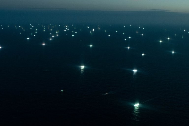 El espectáculo es impresionante. Por la luminosidad, parece el sobrevuelo de una ciudad de mediano porte. Pero no. Son los buques extranjeros -chinos, coreanos, taiwaneses, españoles, portugueses- pescando en la llamada “Milla 201”.