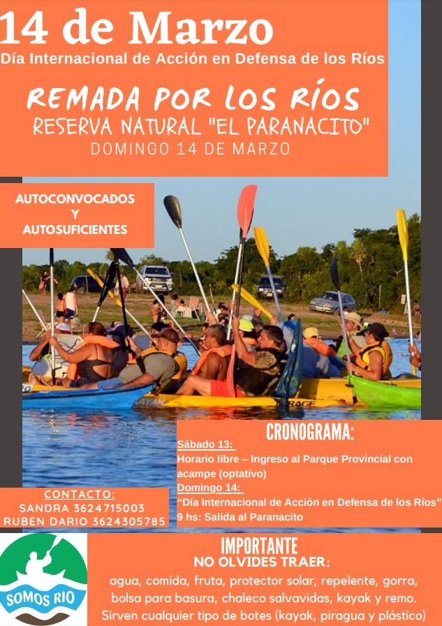 La salida se realizará el domingo 14 a las 9 hs desde el Parque Provincial “El Paranacito”. Pese a esto se convoca a los que quieran, de manera optativa, asistir e ingresar al Parque Provincial el día sábado para pasar el día, acampar allí pudiendo de esa manera disfrutar de las comodidades que ofrece el camping y del fogón que se realizará por la noche, con la actuación estelar del grupo folclórico “La Incendiada”, para realizar la bajada al río el día domingo. La invitación es abierta al público en general que posea botes de cualquier categoría (kayak, piragua y plástico). El costo de acceso al camping es de $300 por auto y $150 por moto.