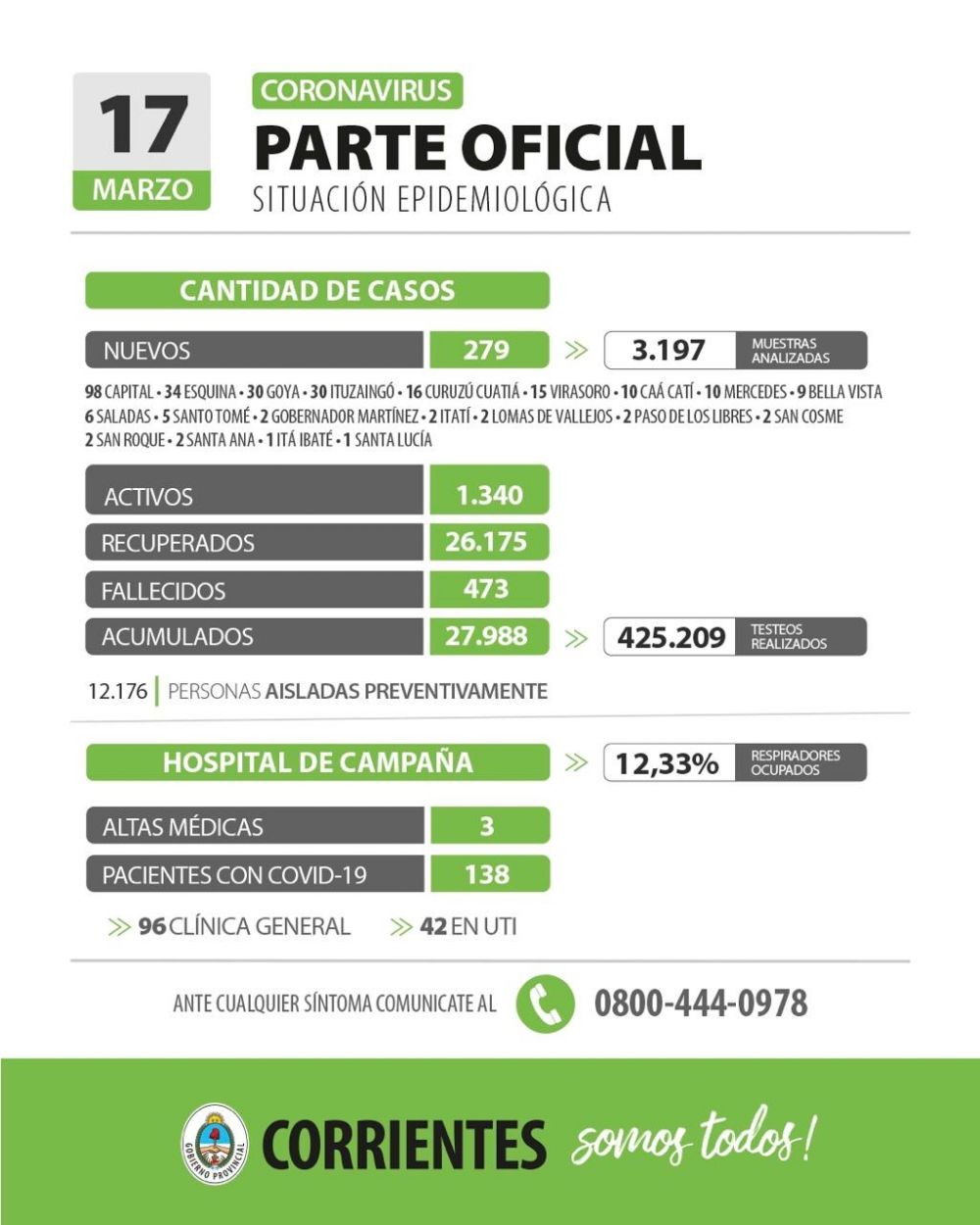 El Gobierno informó este miércoles que se sumaron dos nuevas muertes y 279 contagios de coronavirus en Corrientes. El total de casos acumulados alcanzó los 27.988.