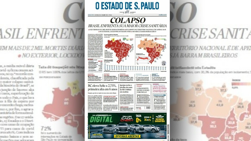El laboratorio federal Fiocruz afirmó que Brasil vive la peor crisis sanitaria de su historia con 24 de los 26 estados más el distrito federal de Brasilia en colapso, con más del 80% promedio de ocupación de camas.