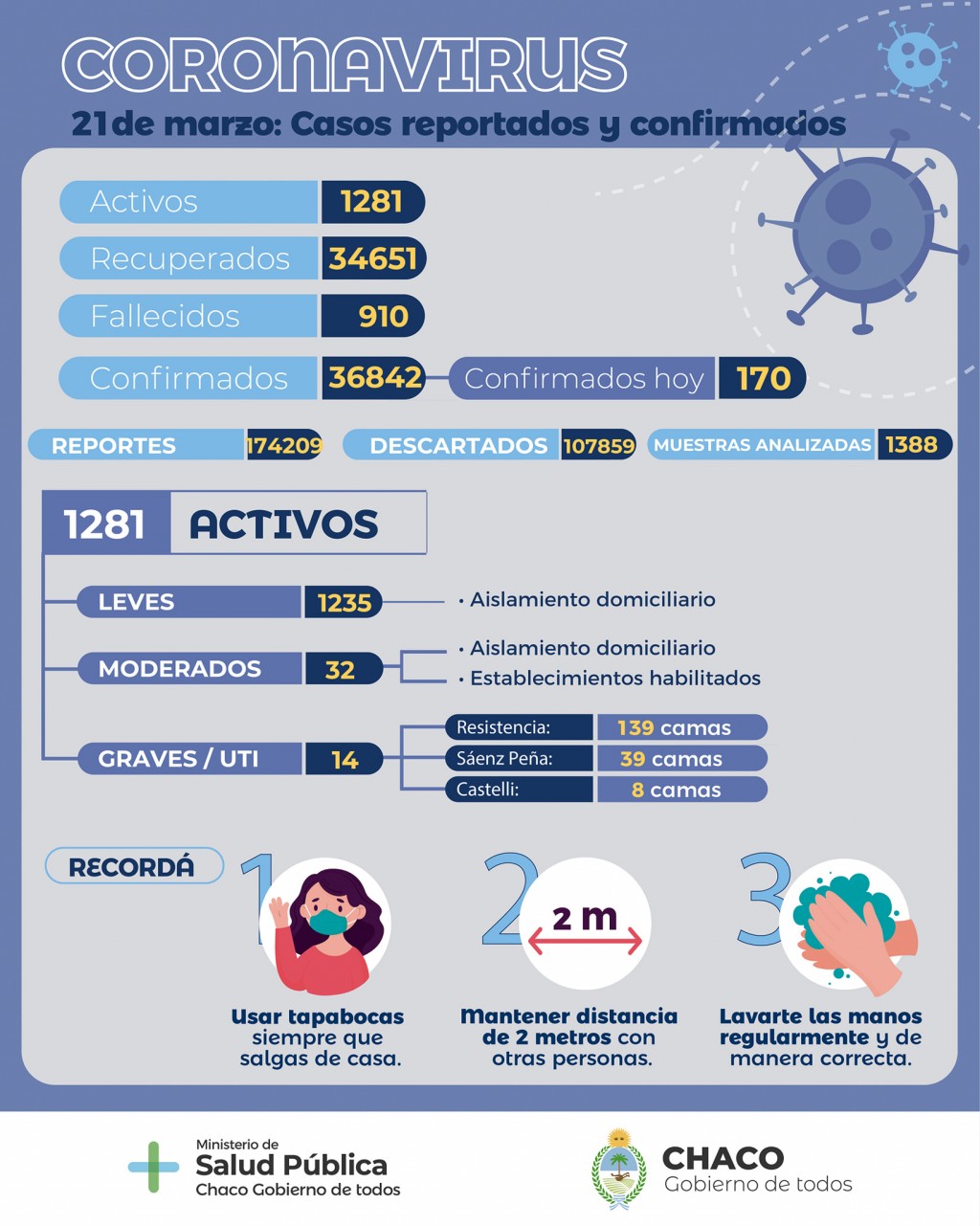 Son 910 las personas fallecidas con el diagnóstico de esta enfermedad y los decesos registrados en las últimas 24 horas, corresponden a dos hombres de 102 años y de 70, ambos de la ciudad de Resistencia.