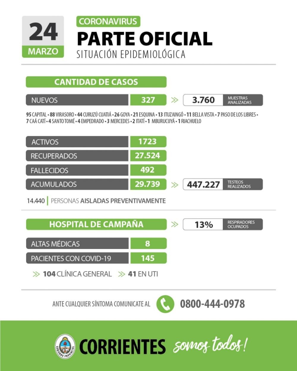 Esto actualiza la cifra de casos activos en 1723 y los acumulados en 29.739 en todo el territorio provincial al 24 de marzo de 2021, con 447.227 testeos realizados desde que inició la pandemia y 27.524 recuperados.