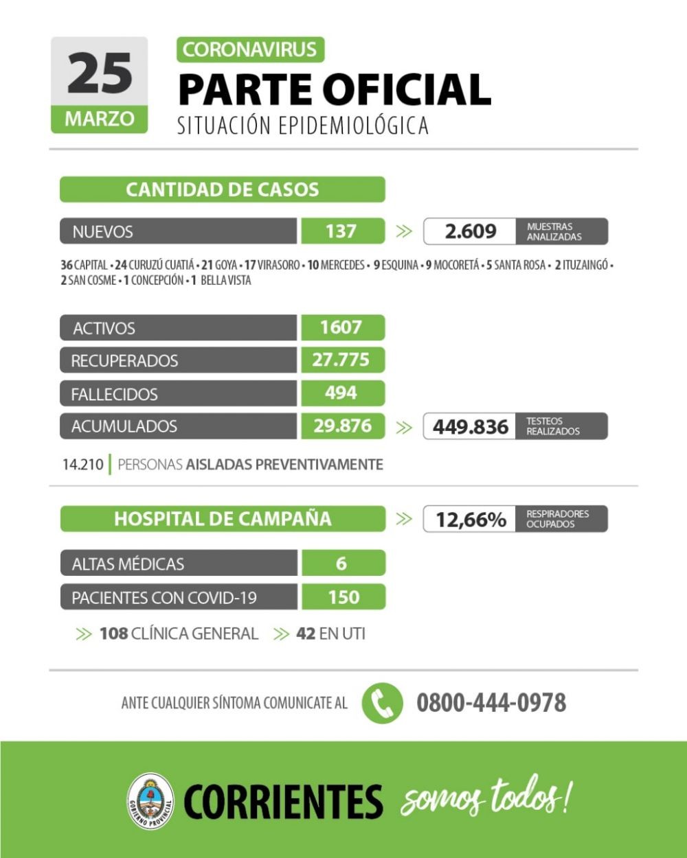 Esto actualiza la cifra de casos activos en 1.607 y los acumulados en 29.876 en todo el territorio provincial al 25 de marzo de 2021, con 449.836 testeos realizados desde que inició la pandemia y 27.775 recuperados. Mientras que son 494 los fallecidos acumulados y 150 los actuales internados en el Hospital de Campaña, con resultado positivo para Covid-19, estando ocupado el 12,66% de los respiradores y donde además durante la última jornada, 6 pacientes egresaron con alta médica y 2 fallecieron. En tanto, permanecen 14.210 personas aisladas preventivamente en sus respectivos hogares.
