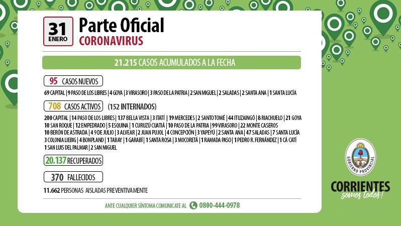Esto actualiza la cifra de casos activos en 708 y los acumulados en 21.215 en todo el territorio provincial al 31 de enero de 2021, mientras que son 370 los fallecidos y 152 los internados en el Hospital de Campaña, con 20.137 recuperados y 11.662 personas aisladas preventivamente en sus respectivos hogares.