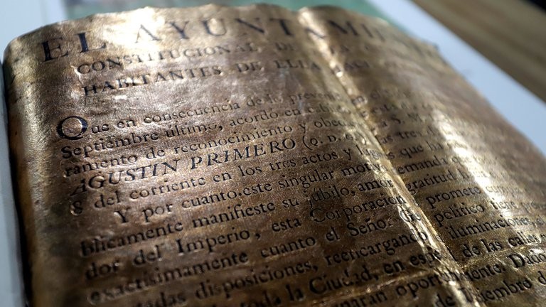 Un documento elaborado en hojas de oro revela que el estado de Puebla se resistió a dejar de jurar al rey de España tras la independencia de México en 1821, siendo de las últimas ciudades que juraron lealtad al nuevo emperador mexicano, Agustín de Iturbide.