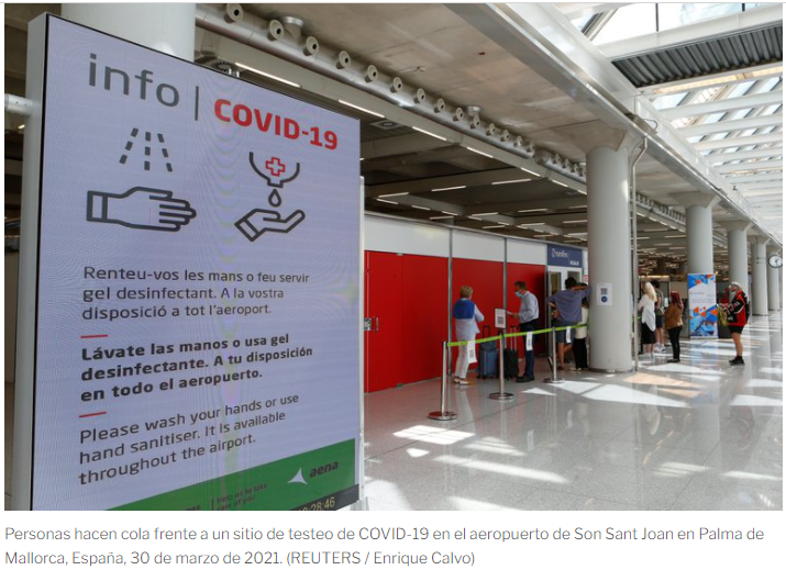 Personas hacen cola frente a un sitio de testeo de COVID-19 en el aeropuerto de Son Sant Joan en Palma de Mallorca, España, 30 de marzo de 2021. (REUTERS / Enrique Calvo)