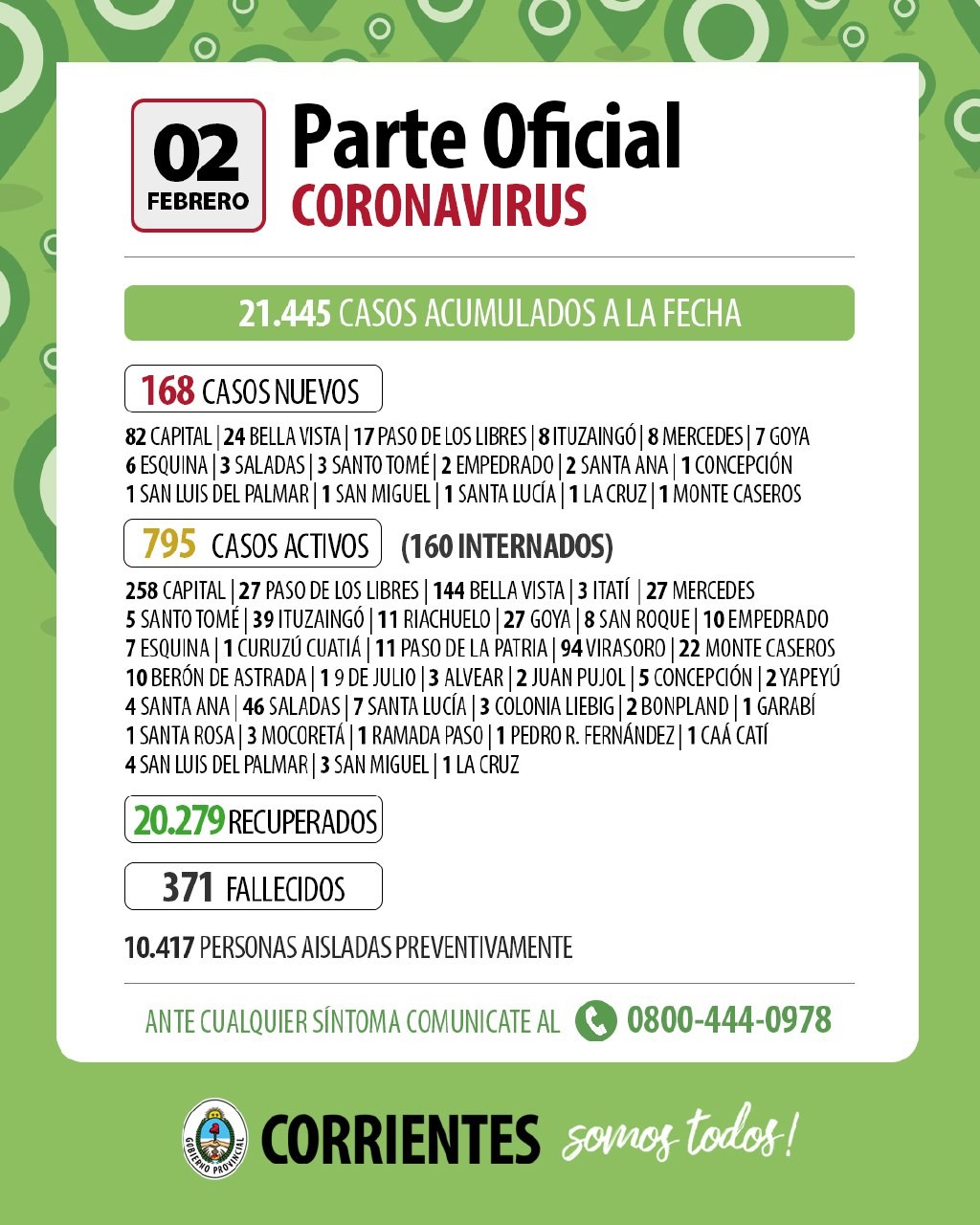 El informe epidemiológico de la provincia de Corrientes registró este lunes 168 nuevos casos positivos de Coronavirus, de los cuales 82 fueron contagios en la ciudad Capital y los 86 restantes en 16 localidades del interior provincial.