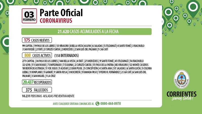 El informe epidemiológico de la provincia de Corrientes registró este miércoles 175 nuevos casos positivos de Coronavirus, de los cuales 99 fueron contagios en la ciudad Capital y los 76 restantes en 14 localidades del interior provincial. Esto actualiza la cifra de casos activos en 808 y los acumulados en 21.620 en todo el territorio provincial al 3 de febrero de 2021, mientras que son 375 los fallecidos y 158 los internados en el Hospital de Campaña, con 20.437 recuperados y 10.231 personas aisladas preventivamente en sus respectivos hogares.