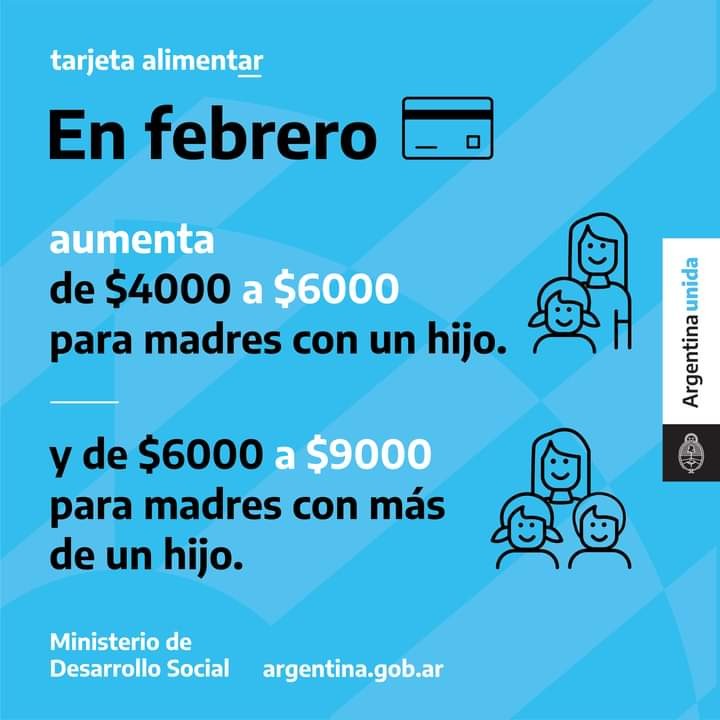 Tras reconocer que en la Argentina los precios de los alimentos continuaron aumentando a pesar del contexto mundial debido a la pandemia por coronavirus, Arroyo confirmó que “en este mes de febrero se va a dar un 50 por ciento de aumento de la Tarjeta Alimentar, que se cargará el próximo viernes 19”.