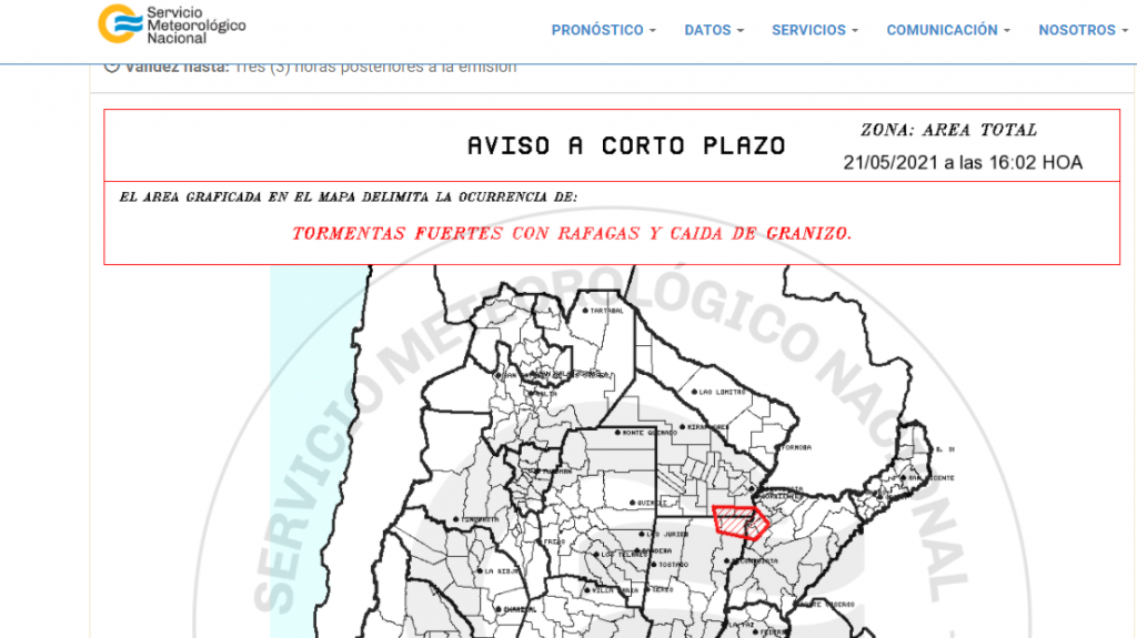 El Servicio Meteorológico Nacional (SMN) emitió un aviso a corto plazo por tormentas fuertes con ráfagas y caída de granizo. El área estipulada incluye los departamentos San Fernando y Tapenagá en el Chaco; mientras que en Santa Fe a los departamentos General Obligado y Vera, y en Corrientes, Bella Vista, Empedrado y Saladas. El aviso fue emitido este viernes 21 de mayo a las 16:02 y tiene una validez de hasta tres horas posteriores a la emisión.