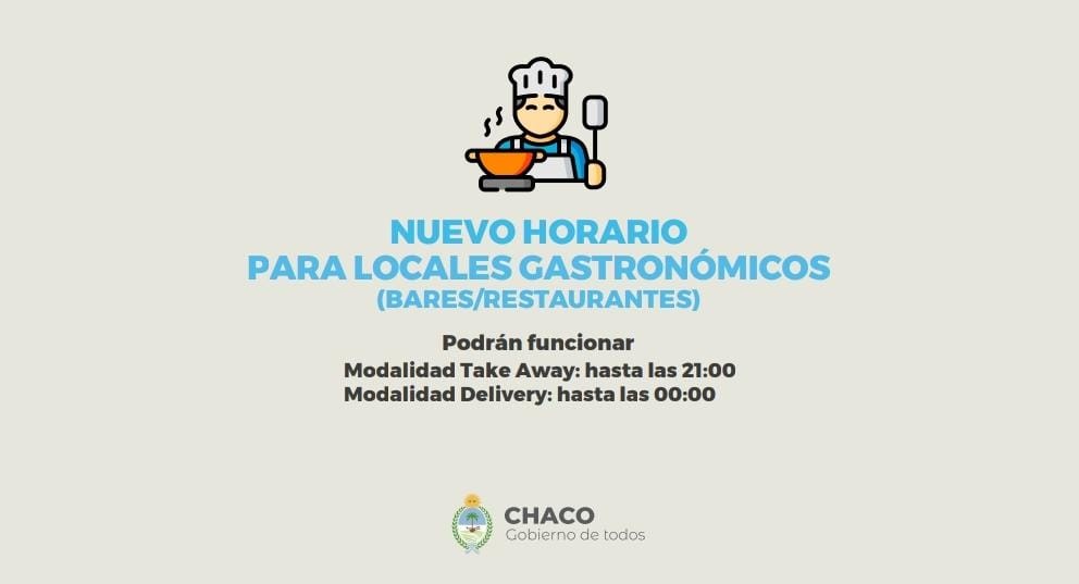 En lo que respecta al sector gastronómico, el gobernador Jorge Capitanich acordó recientemente con la Cámara de Comercio del Chaco extender hasta las 00 el permiso para aquellos restaurantes, bares y espacios que preparen servicios de comida ampliar el horario de venta hasta las 00 pero solo a través del servicio de delivery. No obstante, el retiro de alimentos por parte de las y los clientes solo está permitido hasta las 21.