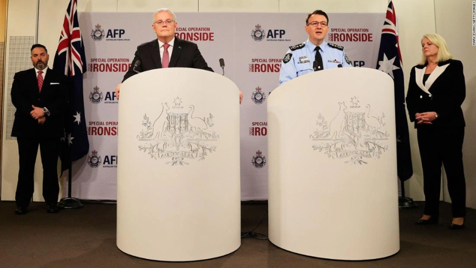 El primer ministro de Australia, Scott Morrison, y el comisionado de la Policía Federal de Australia, Reece Kershaw, hablaron con los medios el 8 de junio en Sydney.
