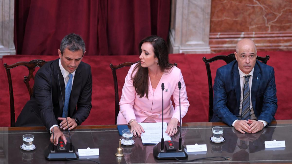La titular del Senado abrió la sesión acompañada por el presidente de la Cámara de Diputados, Martín Menem; y el titular provisional del Senado, Bartolomé Abdala. Luego, se designaron las comisiones de Exterior y Interior que recibirán al primer mandatario en la calle Entre Ríos.