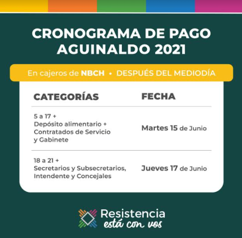 Resistencia comunicó que a partir del martes 15 de junio se realizará el pago del medio aguinaldo 2021 para trabajadores municipales, cuyos fondos estarán disponibles en todos los cajeros del Nuevo Banco del Chaco, después del mediodía.