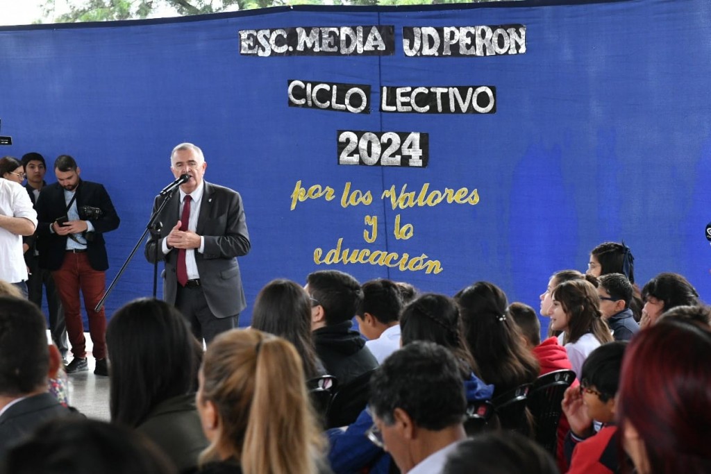 El gobernador, Osvaldo Jaldo, encabezó esta mañana el inicio del ciclo lectivo 2024 en la Escuela media Presidente Juan Domingo Perón (Av. Independencia 4000) de la Capital tucumana. El establecimiento cuenta con 500 alumnos en el turno mañana.