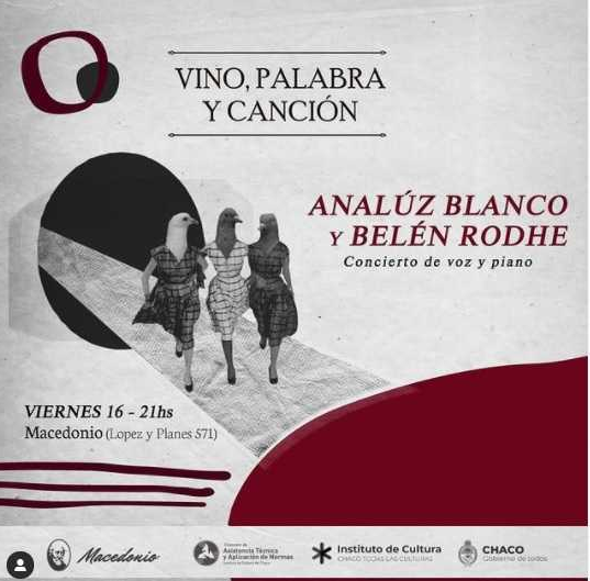 Hoy a partir de las 21, el Espacio Macedonio (López y Planes 571) llevará adelante otra edición del ciclo Vino, Palabra y Canción, iniciativa que reúne a artistas locales en torno a la canción y la poesía. En esta oportunidad, la velada convocará a Analuz Blanco y Belén Rohde.