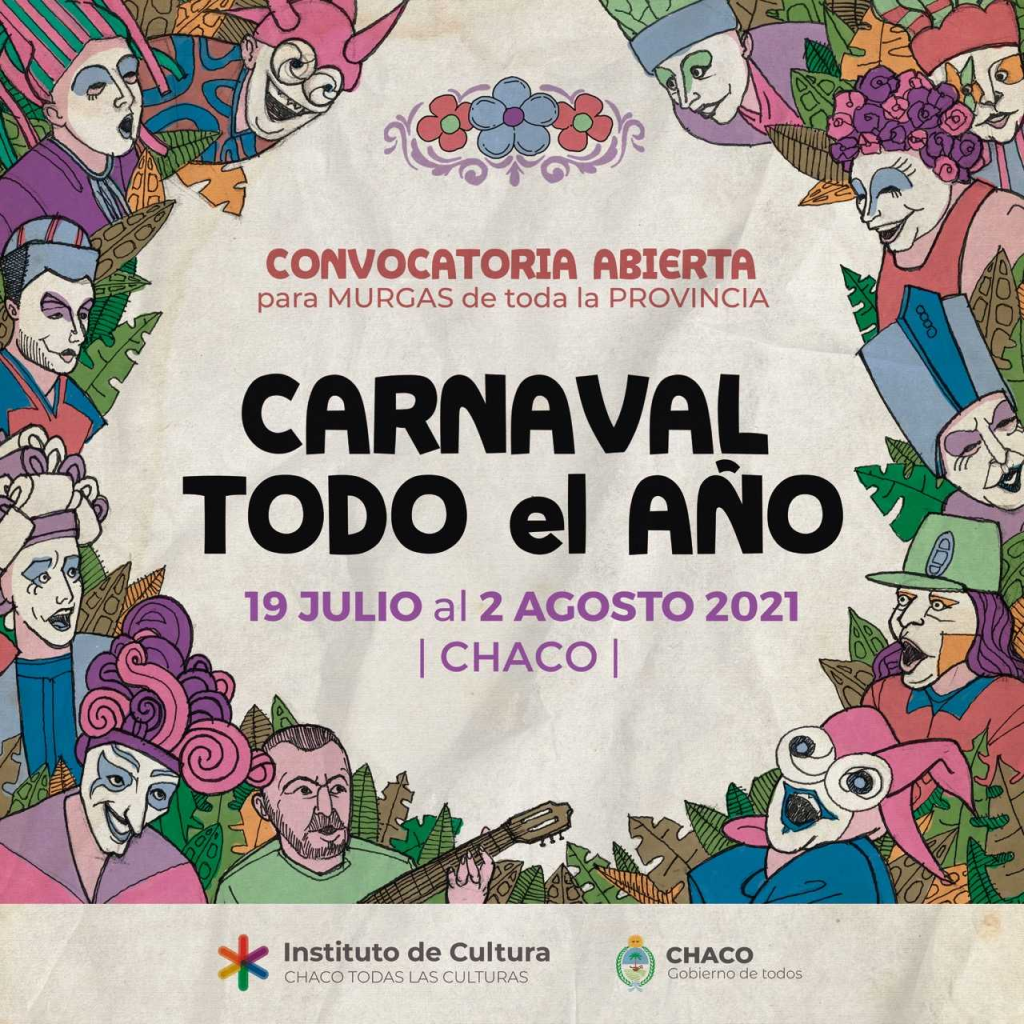 El Instituto de Cultura del Chaco, a través del Departamento de Teatro, informa que a partir de hoy 19 de julio y hasta el 2 de agosto estará abierta la inscripción la primera convocatoria de acompañamiento a producciones artísticas de agrupaciones murgueras de nuestra provincia, en el marco del Carnaval de Invierno y 3er Festival Nacional de Murgas Estilo Uruguayo.