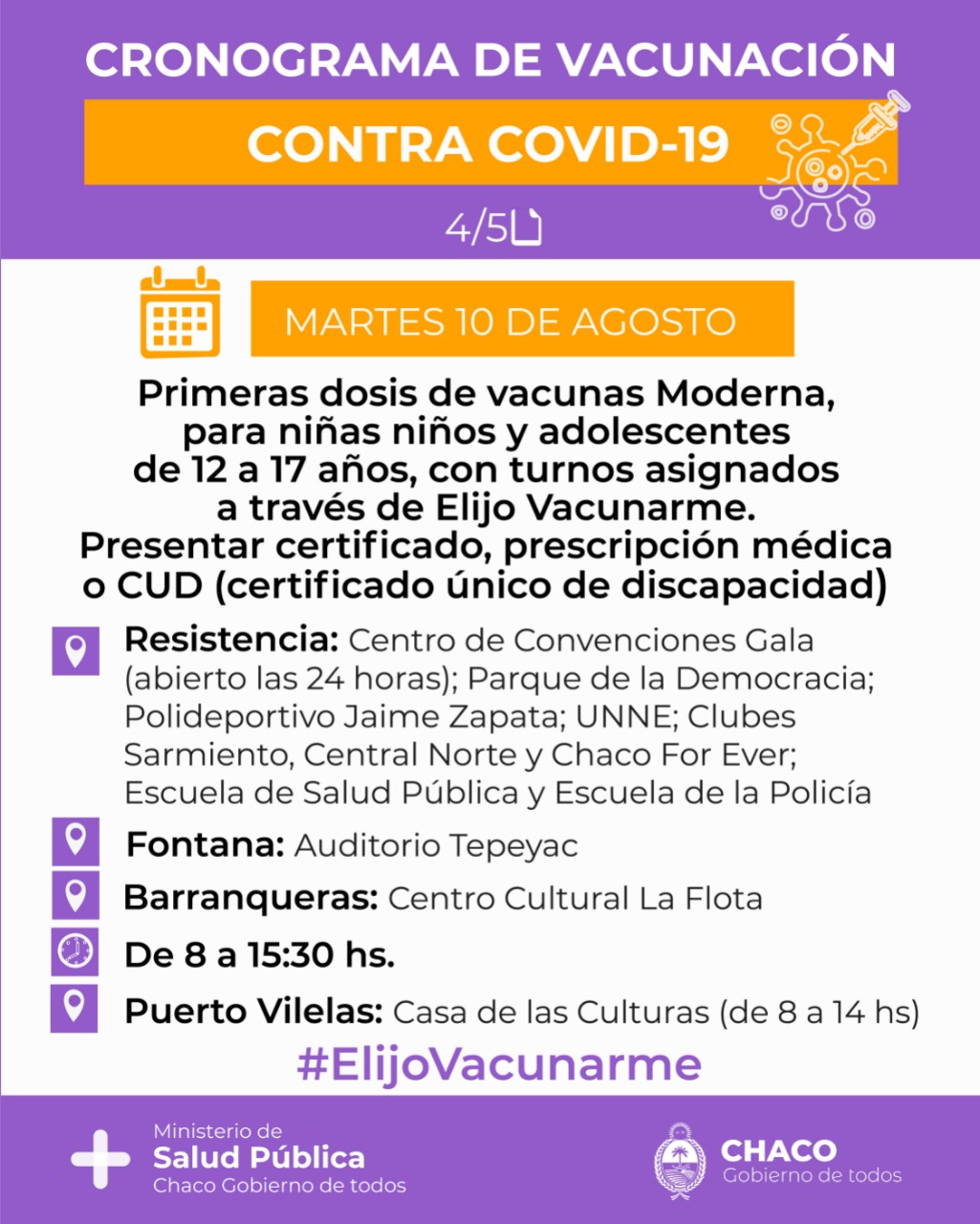-Primeras dosis de vacunas Moderna, para niñas niños y adolescentes de 12 a 17 años, con turnos asignados a través de Elijo Vacunarme. Presentar certificado, prescripción médica o CUD (certificado único de discapacidad).