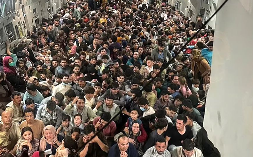 La bodega de un avión militar repleta de afganos que lograron escapar de los talibanes