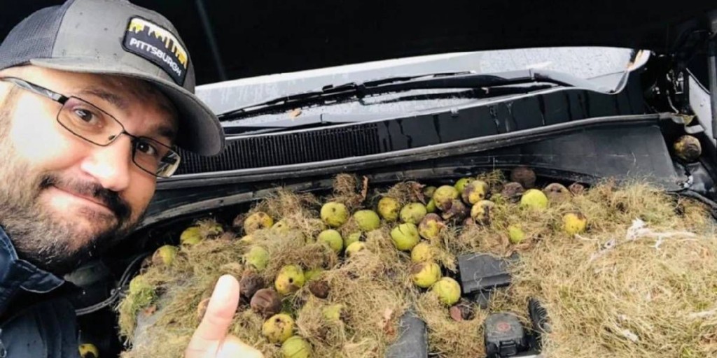 “Tomó alrededor de 45 minutos. Había muchísimas”, dijo el hombre detallando la cantidad de frutos que las ardillas colocaron en el capó.