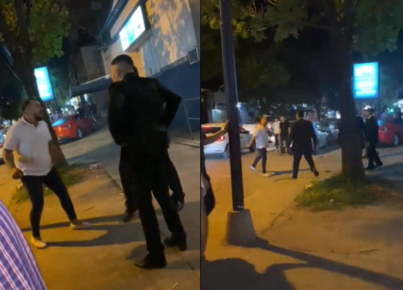 Seguidamente, la persona de remera blanca no le bastó calmarse por lo que continúo incitando a los hombres de seguridad pelearse frente al boliche. Desde otro ángulo se puede ver claramente como después aparece sin remera y a uno de los patovicas sin traje para pelearse y terminar en la calle.