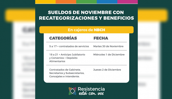 Este martes 30 de noviembre, la Municipalidad de Resistencia inicia el pago de haberes correspondientes al corriente mes al personal municipal y que continuará el 1 y 2 de diciembre próximos.
