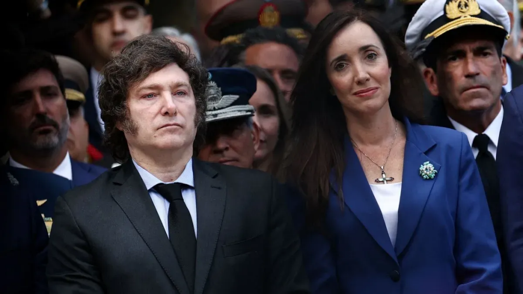 Antes de su discurso, el Presidente colocó una ofrenda floral en el Cenotafio de los caídos, junto a Victoria Villarruel y se abrazaron el público con el fin de mostrarse unidos. En medio de los rumores de una supuesta interna entre ambos mandatarios.