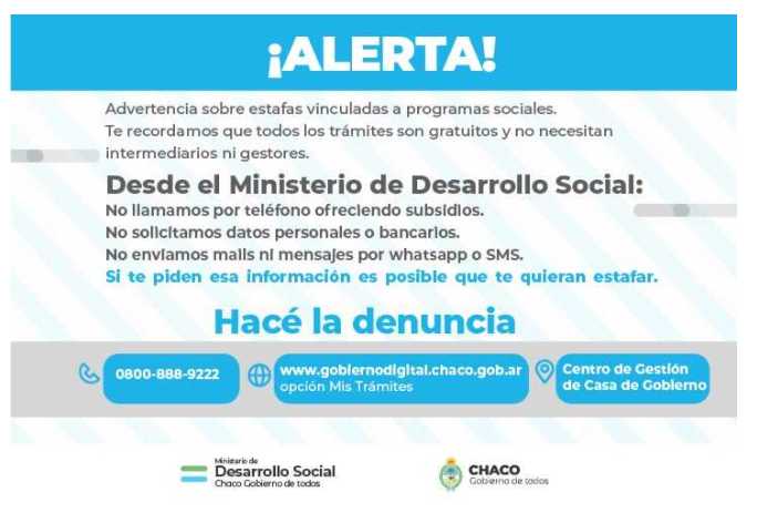 “El Ministerio no llama a nadie ofreciendo subsidios a cambio del pago de un canon, todos los trámites se realizan de forma gratuita, si la persona recibe un llamado de esta naturaleza seguramente se trata de un intento de estafa y pedimos que tome el número y lo denuncie”, indicó el subsecretario de Economía y Políticas Sociales, Diego Luna. En ese sentido, se recordó que la línea para recibir denuncias es el 0800-888-9222, o bien de forma digital ingresando a www.gobiernodigital.chaco.gob.ar a la opción Mis Trámites como también de forma presencial en el Centro de Gestión ubicado en Casa de Gobierno.