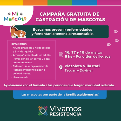 La campaña de castración gratuita “Mi Mascota” finalizó con éxito en el barrio Paykín y a partir de este miércoles 16 de marzo estará presente en el barrio Villa Itatí, más precisamente en la plazoleta situada en Tacuarí y Duvivier. Allí se replicará este programa los días jueves 17 y viernes 18.