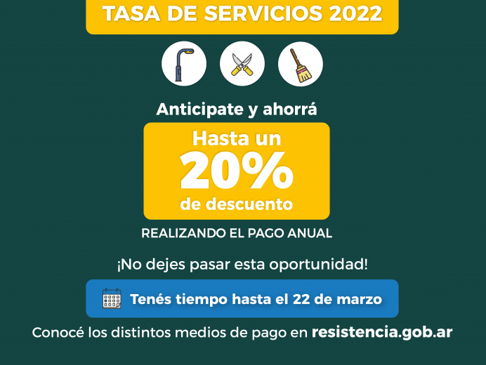 Este martes vence el plazo para acogerse a los beneficios tributarios por el pago anual anticipado del impuesto por tasa de servicios. La promoción del Municipio de Resistencia consiste en descuentos de un 10% por el abono anticipado del período 2022 y otro de igual porcentaje para el buen contribuyente que haya pagado sus impuestos en 2021.