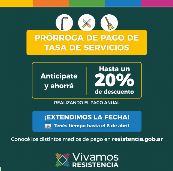 La Municipalidad de Resistencia reiteró que está vigente, hasta el viernes 8 de abril, la prórroga para sumarse a los beneficios que contempla el pago anual anticipado de Tasa de Servicios, que consiste en un descuento del 10% por el abono anticipado del período 2022 y otro 10% para aquel buen contribuyente que también cumplió con este tributo en 2021.