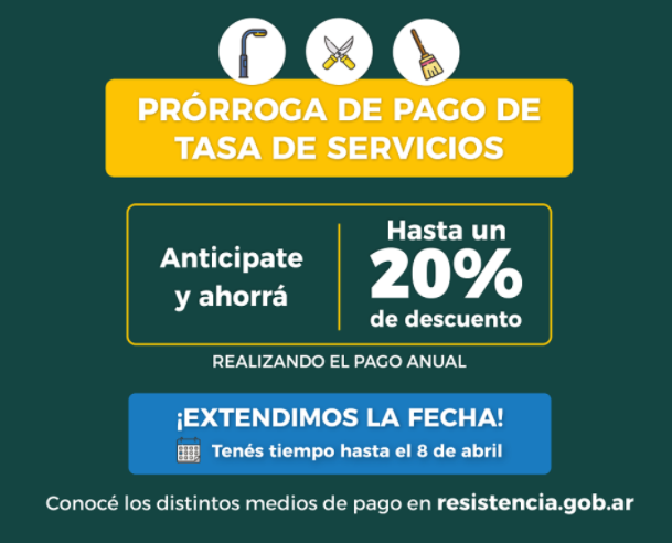 El Municipio de Resistencia informa que continúa vigente, hasta el viernes 8 de abril, la prórroga para sumarse a los beneficios que contempla el pago anual de Tasa de Servicios. Quienes abonen antes de la fecha estipulada pueden acceder a un descuento del 10% por el abono anticipado del período 2022 y otro 10% para aquel contribuyente que también pagó de forma anticipada este tributo en 2021.