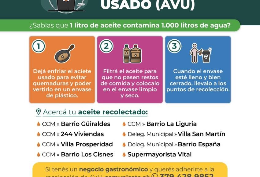 Se puede acercar el aceite recolectado al Supermayorista Vital, a los centros comunitarios ubicados en los barrios Güiraldes, Los Cisnes, La Liguria, Villa Prosperidad y 244 Viviendas y a las delegaciones municipales del barrio España y Villa San Martín.
