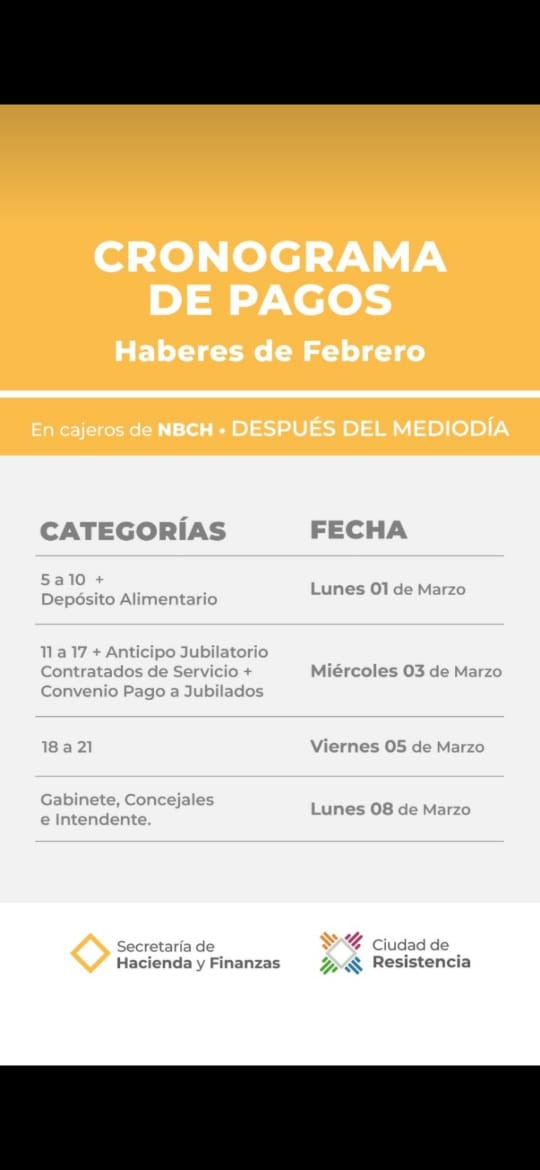 A través de la Secretaría de Hacienda y Finanzas de la Municipalidad de Resistencia, este viernes se conoció el calendario de pago de haberes para trabajadores correspondiente al mes de febrero. El pago se ejecutaría después del mediodía en cajeros del Nuevo Banco del Chaco.