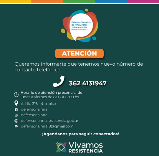 La Defensoría de Niñas, Niños y Adolescentes de Resistencia informó a los vecinos y vecinas que para resolver dudas y denunciar cualquier vulneración de derechos pueden contactarlos de forma presencial, por teléfono y mediante las redes sociales.