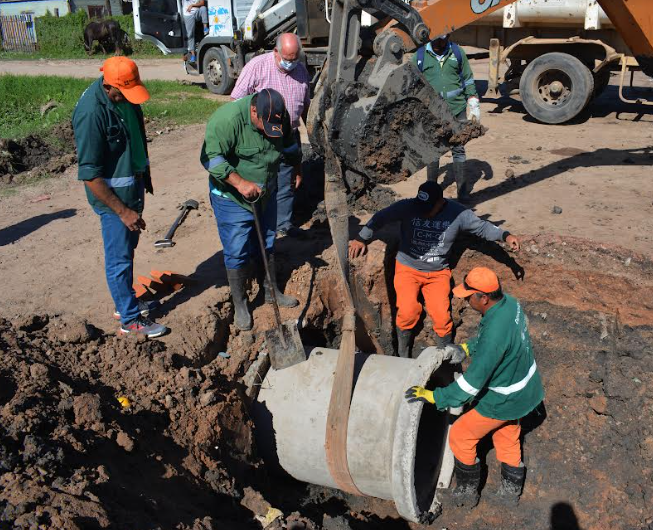 En el límite entre villa Don Andrés y el barrio Zampa, trabajadores municipales del área de Desagües realizaron el recambio de tubos del cruce de calles Chaco y Honduras, a fin de mejorar la circulación de las aguas y evitar futuros anegamientos.