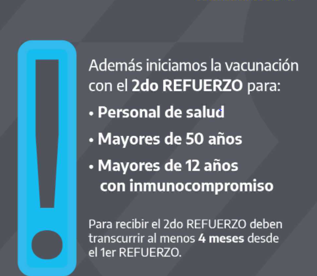 El Ministerio de Salud de la Nación insta a la población que haya cumplido cuatro meses desde la aplicación del primer refuerzo, a concurrir a vacunatorios y recibir el segundo.
