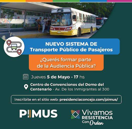 Resistencia convoca a la comunidad a participar de la audiencia pública vinculante para tratar el proyecto de ordenanza sobre el Plan Integral de Movilidad Sostenible (PIMUS) para implementar en la ciudad un transporte público integrado, eficiente y optimizado. Se realizará el próximo jueves 5 de mayo, a las 17 horas, en el Centro de Convenciones Domo del Centenario, ubicado en Av. De los Inmigrantes 300. Para poder participar en la misma está abierta la inscripción a través de la página del Concejo Municipal: presidenciaconcejo.com/pimus/.
