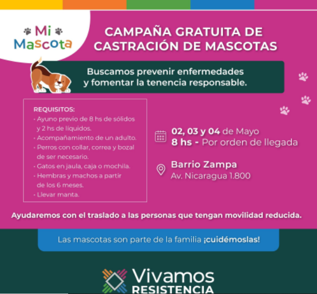 La castración gratuita que ofrece la Municipalidad de Resistencia a través del programa "Mi Mascota" continuará los días 2, 3 y 4 de mayo. El quirófano móvil se establecerá en avenida Nicaragua al 1800, en el barrio Zampa, mientras que las jornadas 5, 6 y 9 del mismo mes se trasladará al barrio Insssep, más precisamente en avenida Islas Malvinas al 2675.