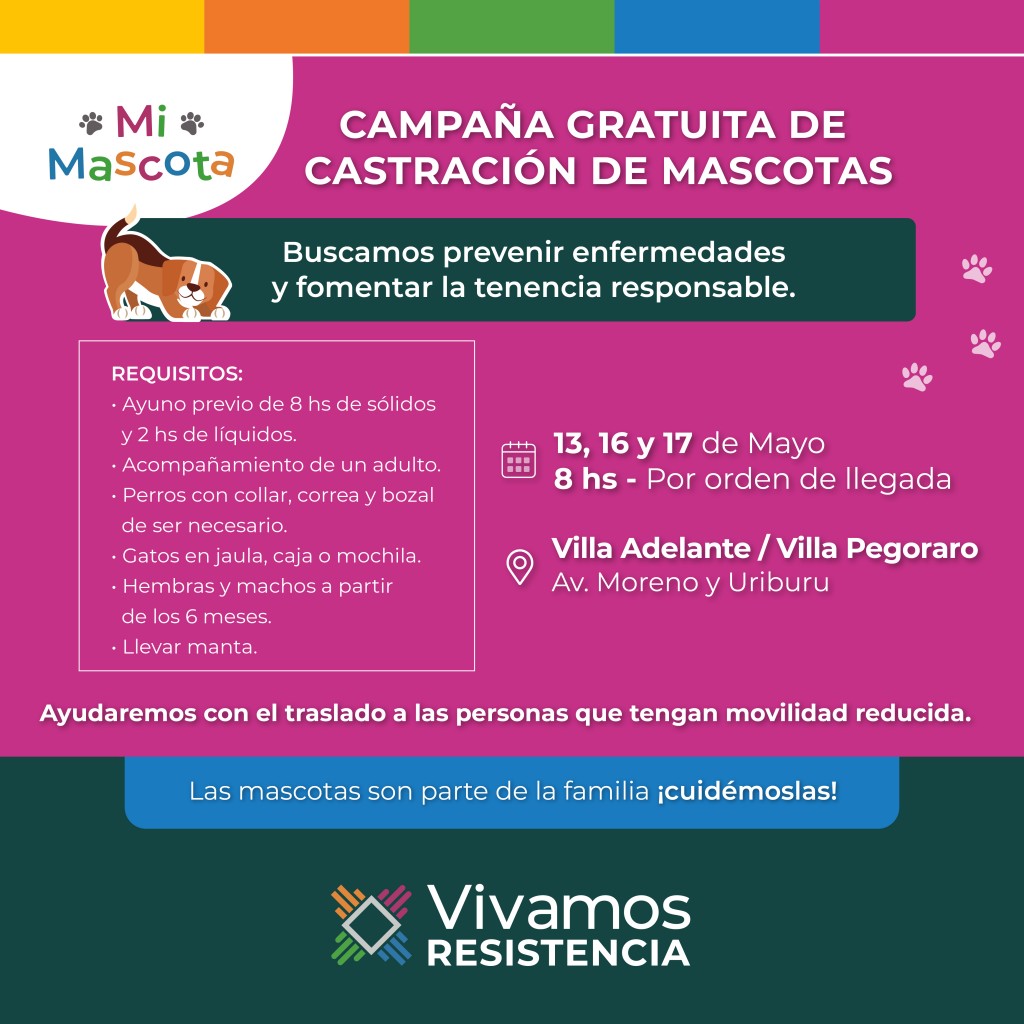 La castración gratuita de mascotas que Resistencia ofrece a los vecinos y vecinas estará este viernes 13 en el barrio Villa Pegoraro, en el cruce de avenida Moreno y calle Uriburu, donde continuará en el mismo lugar el lunes 16 y el martes 17 de mayo.