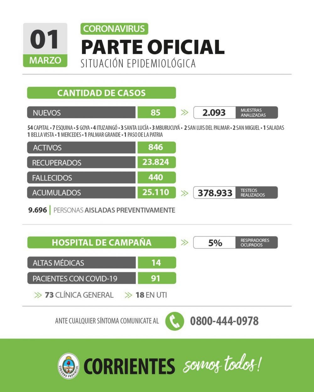 Esto actualiza la cifra de casos activos en 846 y los acumulados en 25.110 en todo el territorio provincial al 1 de marzo de 2021, con 378.933 testeos realizados desde que inició la pandemia y 23.824 recuperados.