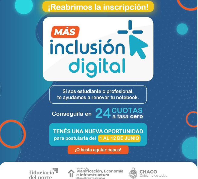 Del 1 al 12 de junio o hasta agotar cupos, podrán postularse chaqueñas y chaqueños de entre 18 y 35 años que sean estudiantes universitarios o terciarios de instituciones públicas, profesionales trabajando en relación de dependencia o monotributistas. La inscripción se realiza a través de ‘Tu Gobierno Digital’ por medio de la aplicación “Inclusión Digital”, donde además se encontrarán información detallada de los requisitos.