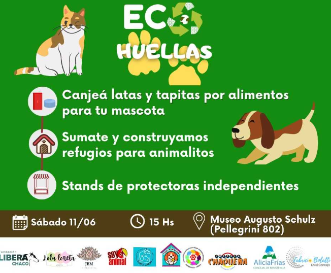 El canje ecológico consiste en un punto de intercambio donde los vecinos y vecinas pueden acercar tapitas plásticas y latas vacías a cambio de alimento para mascotas. Además, también las familias y personas que asistan podrán construir junto a las y los protectores, casitas para mascotas.