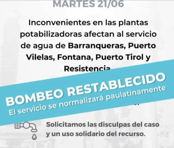 Por otra parte, la empresa confirmó que fue reestablecido el bombeo en el área metropolitana del Gran Resistencia que ayer se vio afectado e informó anoche que "el servicio se normaliza paulatinamente".