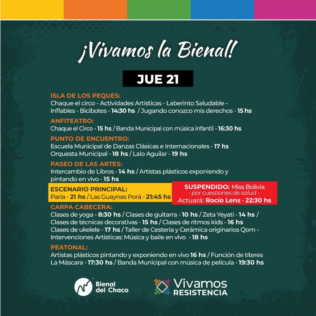 En el escenario principal de la Bienal, a partir de las 22:30 horas, actuará Rocío Lens, compositora y cantante, referente del rock regional. Previo a ella estarán los grupos “Paria” a las 21 horas y “Las Guaynas Porá”, a las 21:45 horas.