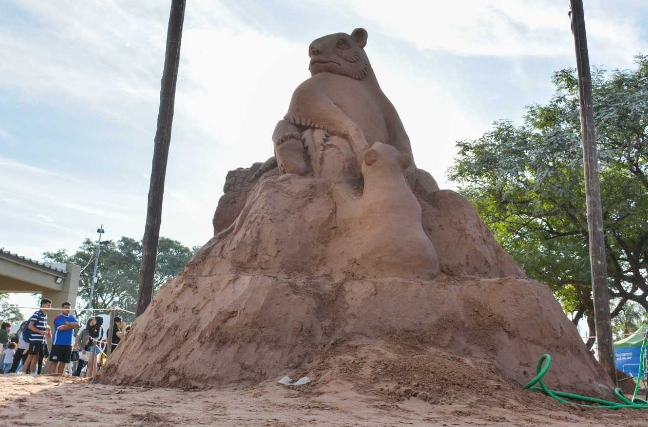 Tuvimos contacto directo con Alejandro, aquí, en este predio y nos dejó unas palabras: “Para mí el arte es todo, y es lo que trato de difundir, de compartirlo. Luego de un recorrido vasto trabajando con la flora en extinción, con los pueblos originarios, conocí la arena y ya llevo más de 70 obras realizadas en ese material. Para mi la Bienal del Chaco siempre fue algo muy lejano, y deseaba mucho estar acá. No me había imaginado nunca estar en este lugar, dentro de este proyecto tan ambicioso, para mi es un gran honor estar hoy”. Y sobre su técnica nos comenta: “La técnica que estuve utilizando estos días se llama Hardpack y consiste en hacer una piedra de arena, y el secreto es que la arena esté compactada de manera uniforme para que yo pueda hacer un gran tallado y la estructura logre sostenerse, como si yo fuera una impresora 3D humana hasta finalizarla”. Concluyendo, Alejandro en diálogo nos dice: “La Bienal de Escultura es un contexto muy cálido, no importa cuales sean las circunstancias climáticas y estoy muy feliz de estar acá. Esta Bienal es una Bienal muy particular, una en la que Fabriciano no está aunque yo sé que anda por acá. Pienso en todo el legado que nos dejó y en seguir con impulso y expectativas, así que los invito a que me vengan a visitar y donde estemos, nos encontremos”.